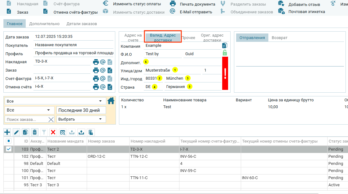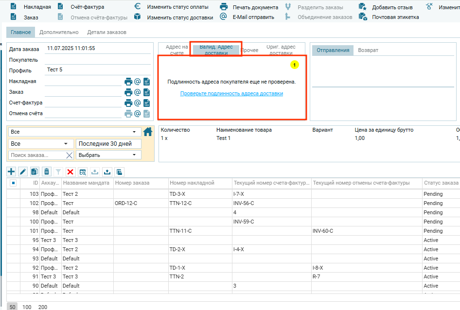 Для валидации пользователь нажимает на ссылку и попадает в модальное окно для валидации адреса. Если валидация прошла успешно, то в вместо ссылки появляется адрес, который и будет использоваться для распечатки этикетки для доставки заказа.