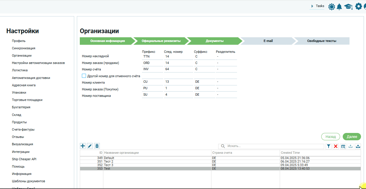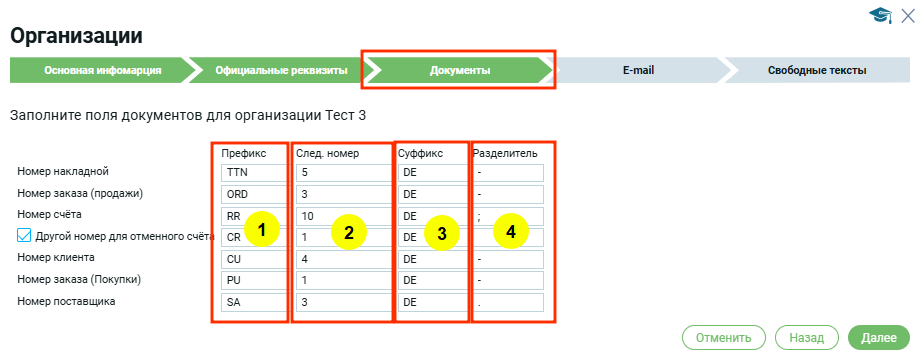 - Следующий номер документа — номер нового обьекта, который будет создан в системе;
