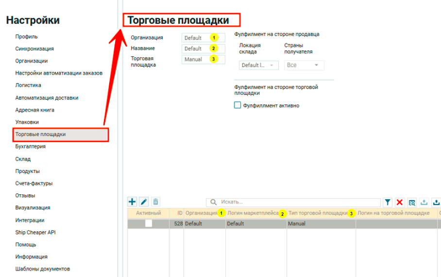 Перейти в настройки, вкладка «Торговые площадки» — в таблице «Default» мануальный аккаунт. Одним из основных параметров в аккаунте торговой площадки является Организация. В данном случае мануальный аккаунт (торговая площадка (3)) с названием «Default» (2) — организация «Default» (1).