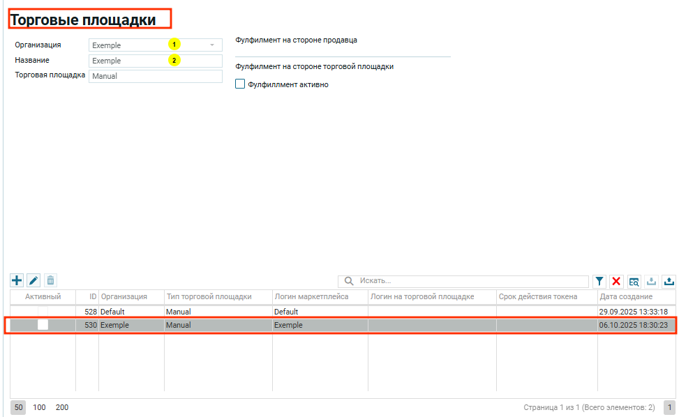 Автоматическое создание мануального аккаунта «Example» в настройках торговых площадок после создания новой Организации