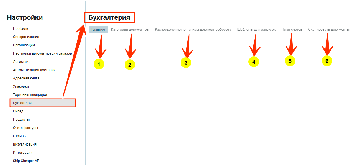 Перейти в «Настройки«, в списке настроек выбрать пункт «Бухгалтерия«. Откроется интерфейс для работы с настройками бухгалтерии.