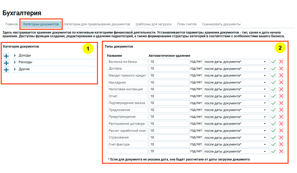 В этой вкладке создаются статьи финансового учёта, к которым впоследствии будут привязываться типы документов.