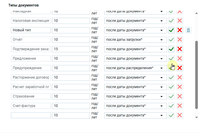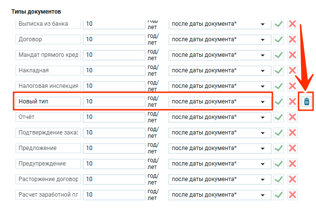 Что бы удалить созданный пользователем тип документа, нужно нажать на иконку . Удалить можно только те документы, которые создал пользователь, дефолтные документы не удаляются.