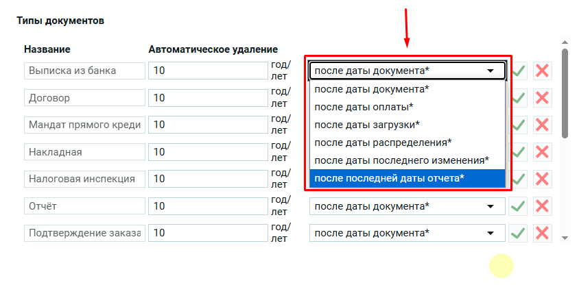 3. Для изменения даты отсчета хранения документов нужно выбрать из выпадающего списка нужное условие и также нажать на зеленую галочку для подтверждения.