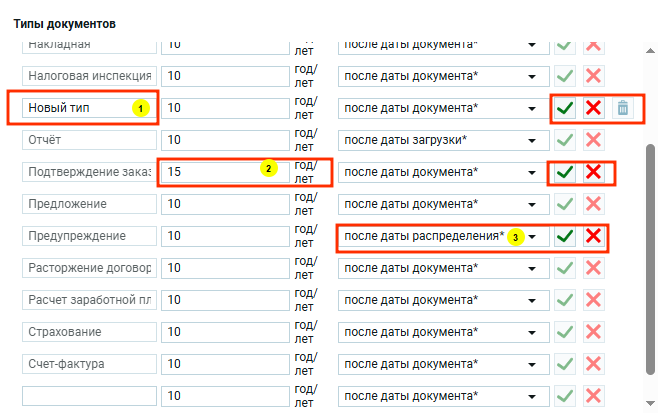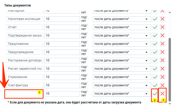 Для того, что бы добавить новый тип документа нужно в пустое поле (1) ввести названия нового типа документа и нажать на зеленую галочку (2) . Если нужно удалить из поля значение до его сохранения, нажми на красный крестик (3)