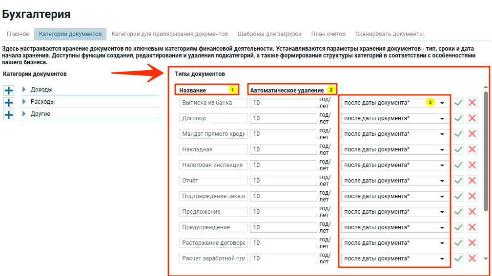 2. Автоматическое удаление — указывает срок, по прошествии которого документы будут удалены из системы без участия пользователя. По умолчанию стоит срок 10 лет.