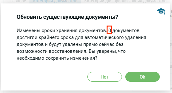 При редактирование сроков и условий отсчета для хранения типов документов, после нажатия на зеленую галочку, появится модальное окно с предупреждением о том, что есть уже созданные документы в «X» количестве которые могут быть удалены навсегда.