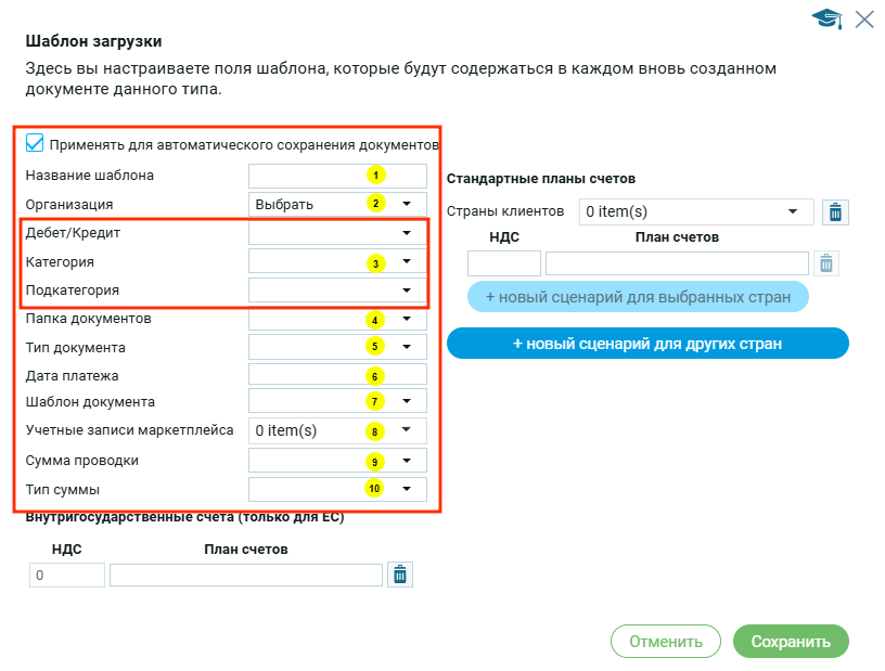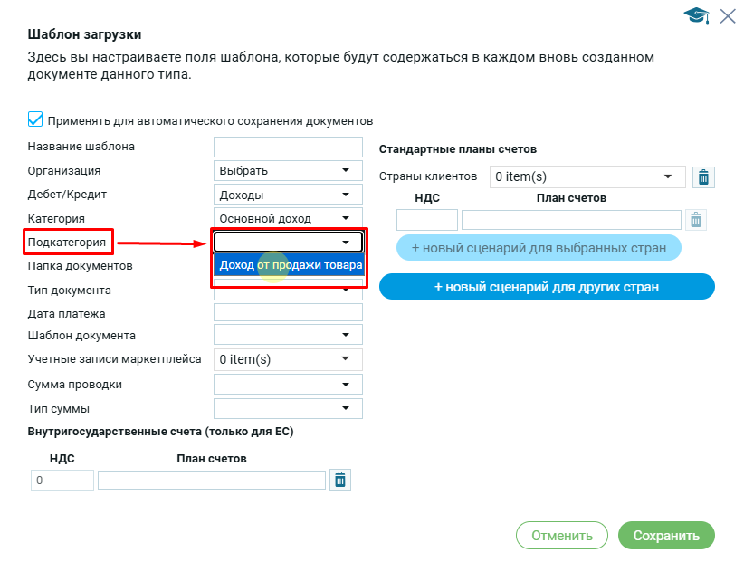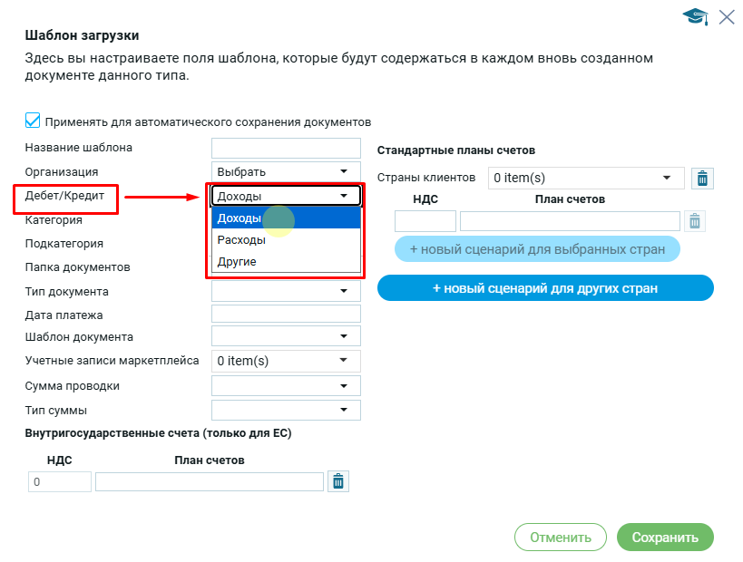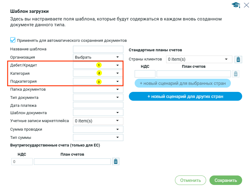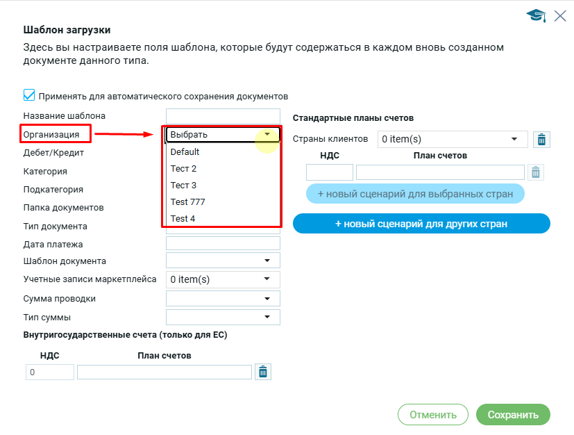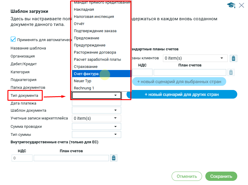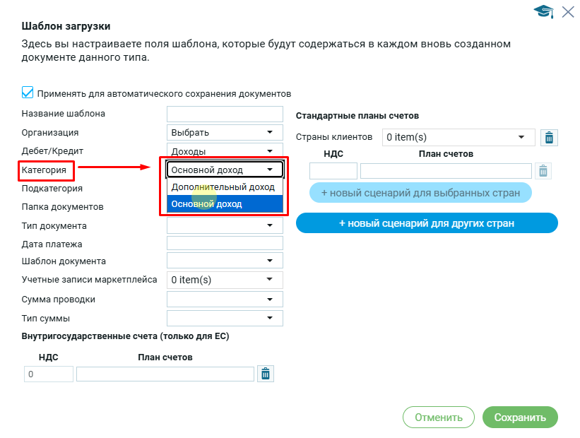 При создании шаблона для загрузки категории документов выбираются из выпадающего списка, сформированного на основе ранее созданных пользователем категорий.