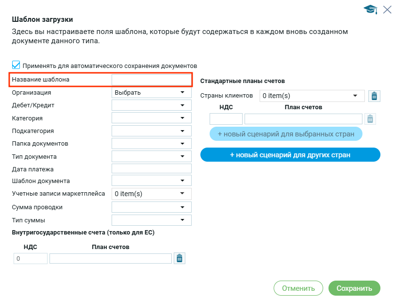Название шаблона для загрузки документов пользователь вносит в поле самостоятельно. Именно это название будет отображаться в выборе шаблонов для загрузки документов.