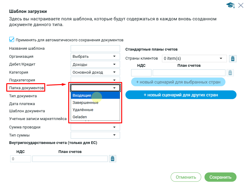 При создании шаблона для загрузки папка документов выбирается из выпадающего списка, сформированного на основе ранее созданных локаций для распределения.