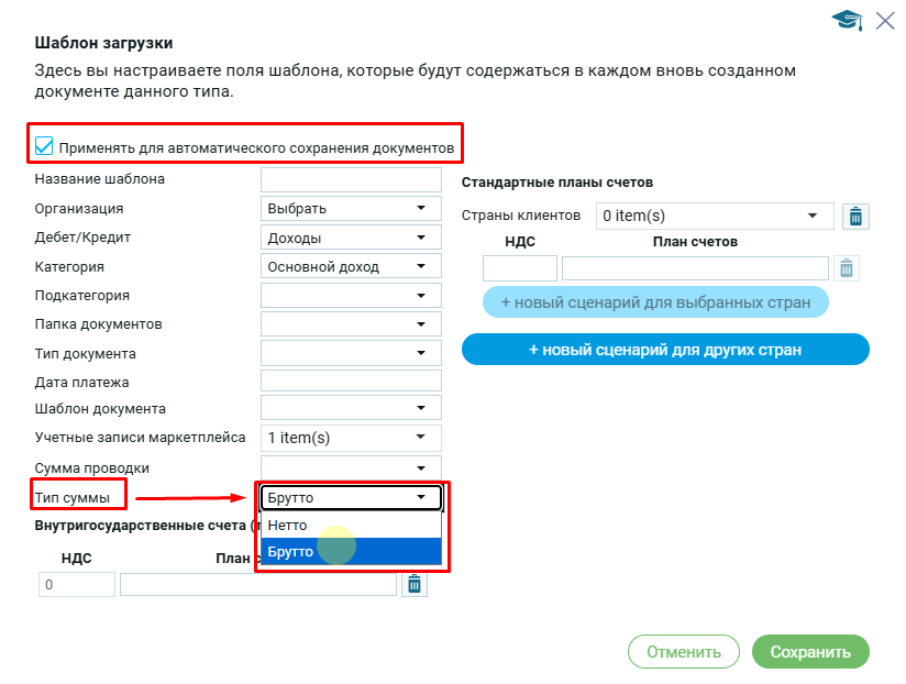 Выбор значения в поле тип суммы доступен только для шаблона с активной функцией автосохранения документов.