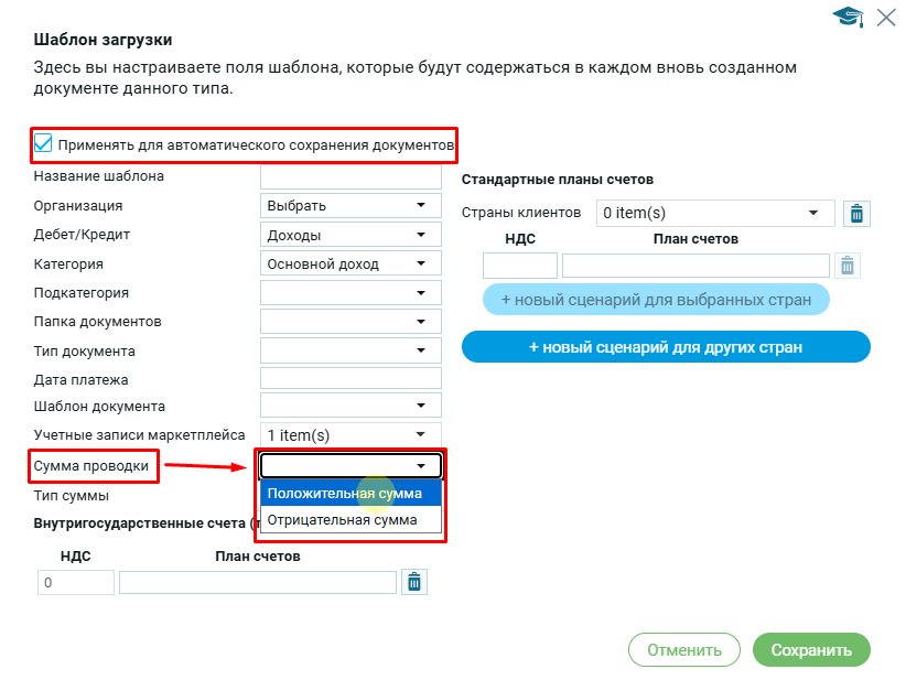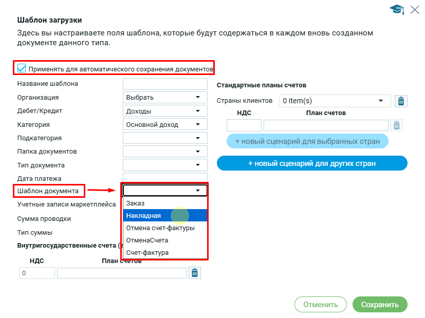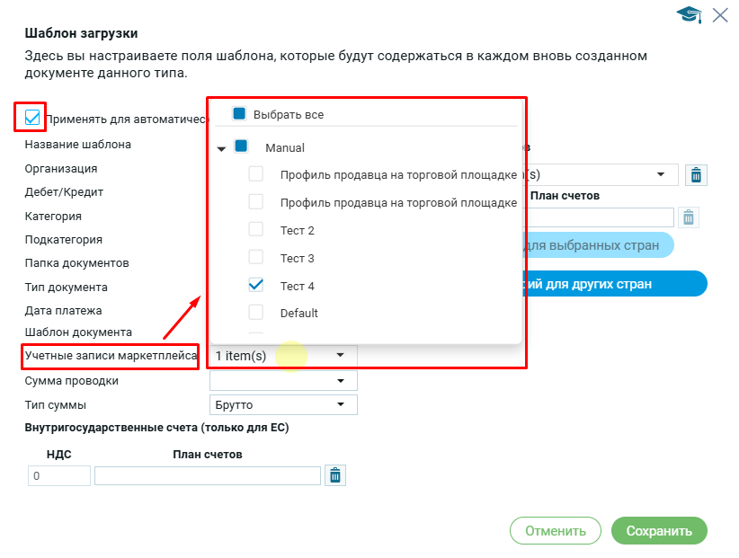 Выбор аккаунта маркетплейса доступен только для шаблона с активной функцией автосохранения документов.