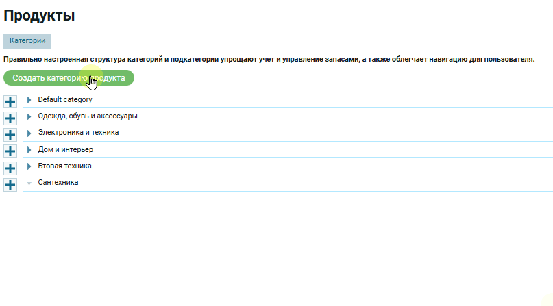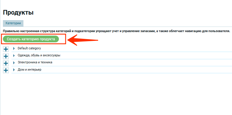 Для создания категории нужно нажать на зеленую кнопку «Создать категорию продукта«