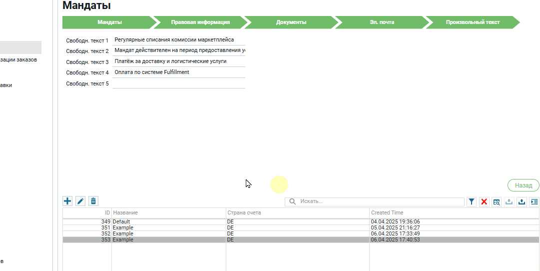 Для редактирования / создания произвольного текста нужно перейти в модальное окно. Для этого нужно нажать кнопку «Создать» или выбрать в таблице мандат и нажать на кнопку «Редактировать».