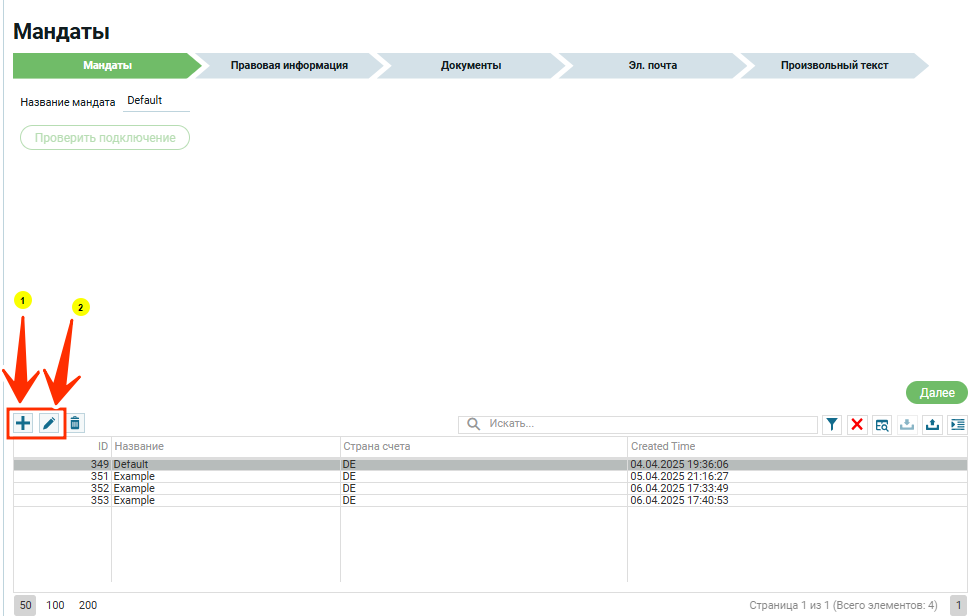 Для добавления мандата нужно нажать на кнопку , для редактирования нужно нажать на кнопку .