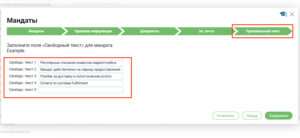 Произвольный текст для мандата — это дополнительное поле, в которое можно внести комментарии, пояснения или условия, связанные с мандатом