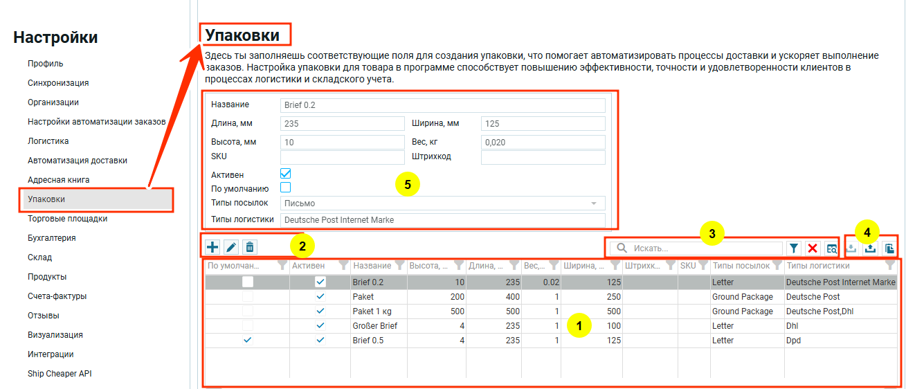 На скрине выделено 5 основных пунктов, нумерация которых соответствуют пунктам в сайдбаре справа. Каждый пункт содержит более подробное описание настроек. 6 пункт — создание / редактирование упаковки в модальных окнах.