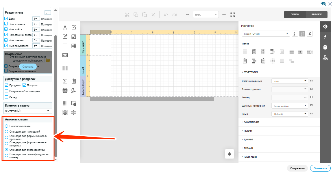 Например, для создания счет-фактуры будет использоваться печатная форма счет-фактуры и соответственно в модуле Автоматизация будет активирована позиция Стандарт для счет фактуры.