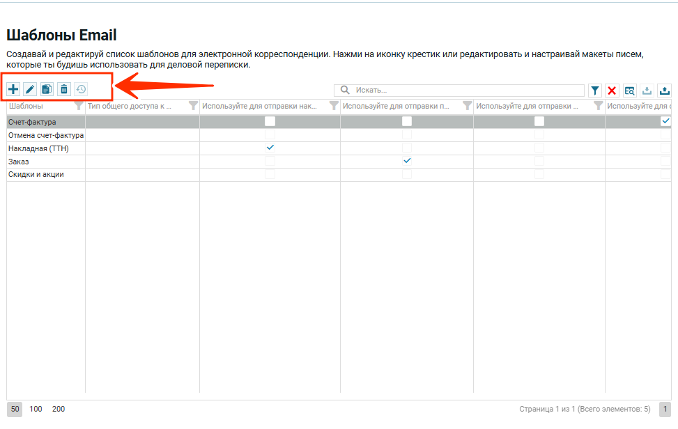 Кнопки управления шаблонами находятся в верхнем левом углу над таблицей