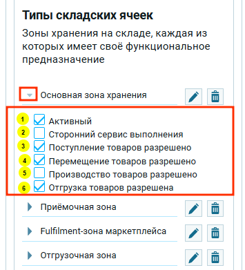 У каждого типа ячейки есть набор параметров, определяющих, что с товаром в этой ячейке разрешено или запрещено делать. Для того, что бы увидеть данные параметры, нужно нажать на треугольник слева от названия типа.