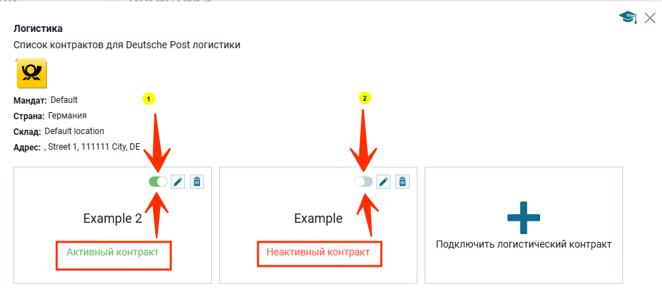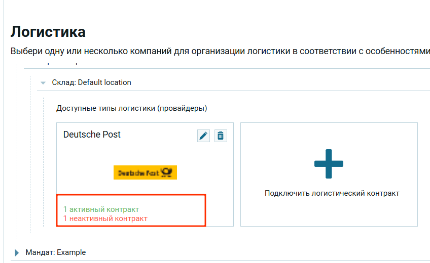 В данной логистике мы видим один контракт активный, другой нет. Если вернуться к первому уровню настроек логистики, можно увидеть, что у данного типа логистики под логотипом будет отображено количество активных и неактивных контрактов: