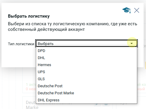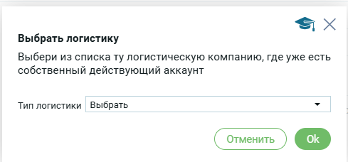 Откроется модальное окно, где нужно из списка типов логистик выбрать ту, где у пользователь уже есть действующий аккаунт.