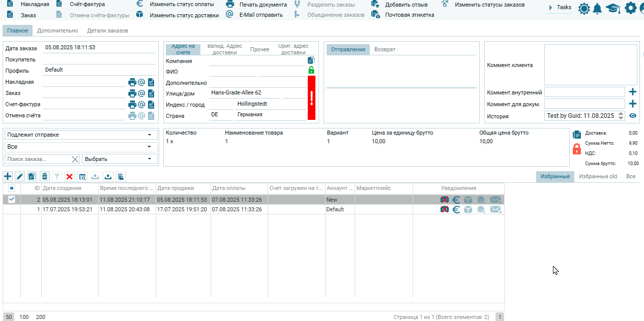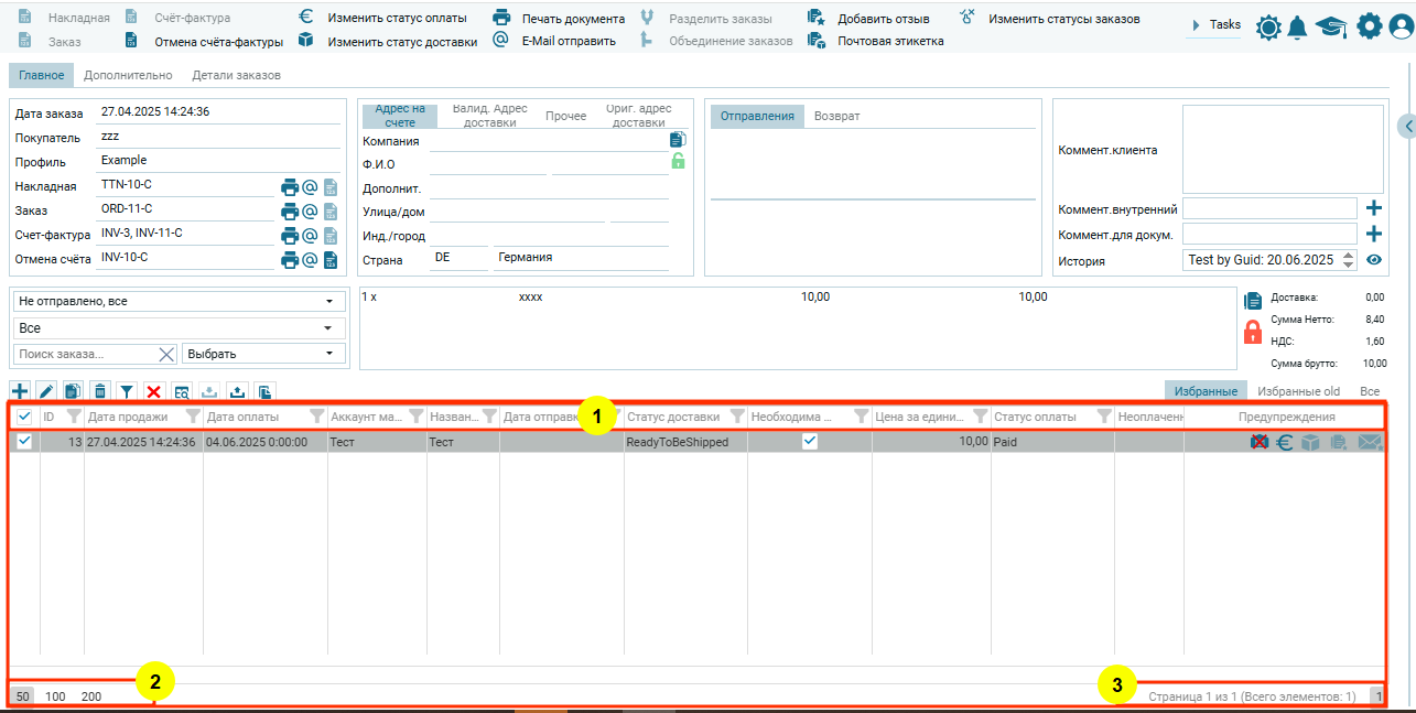 - Всего элементов: 1 — это значит, что в списке создано всего 1 заказа.