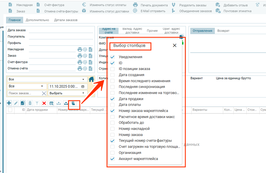 Данная функция очень важна в интерфейсе продаж, так как доступных столбцов в таблице более 130, просматривать информацию по всем столбцам одновременно не эффективно для управления заказами. Поэтому, пользователь может выбирать необходимые столбцы для комфортной работы с данными.