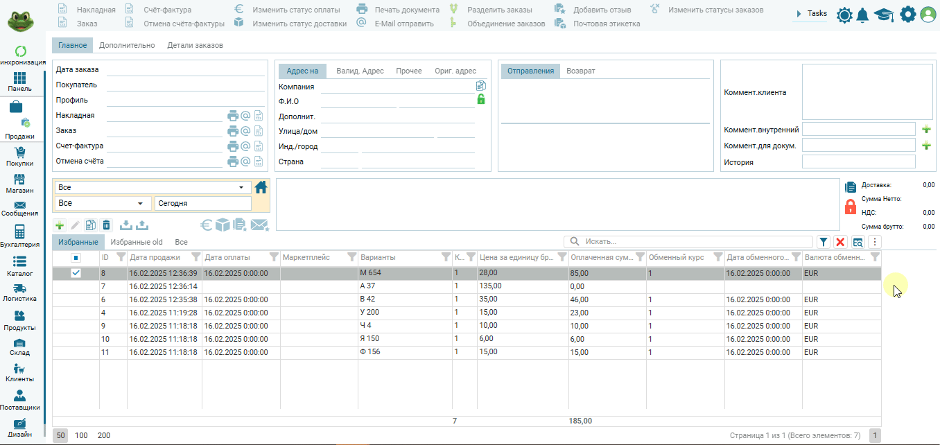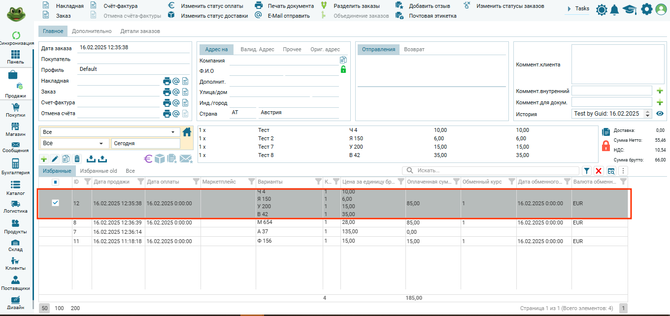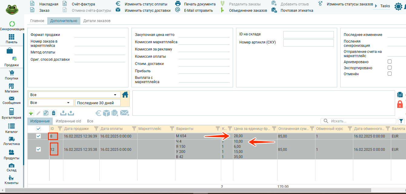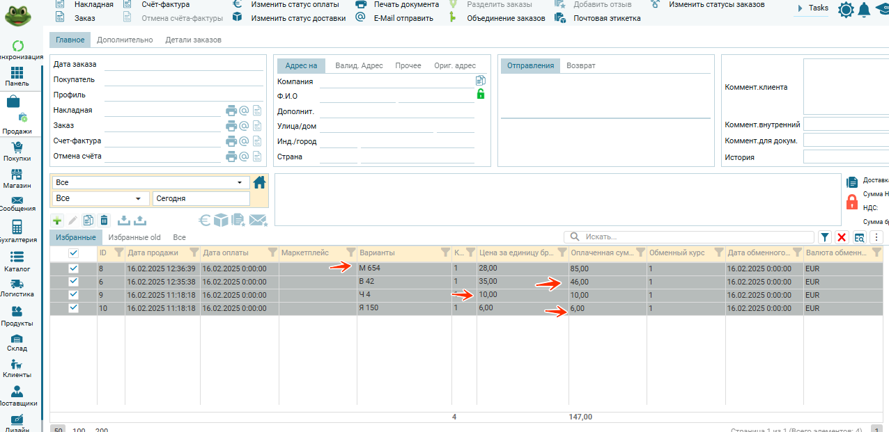 Подробности по товарным позициям в редакторе заказа: