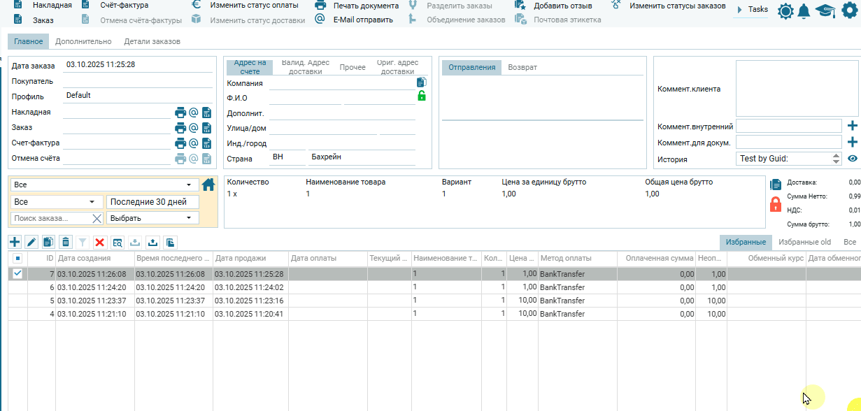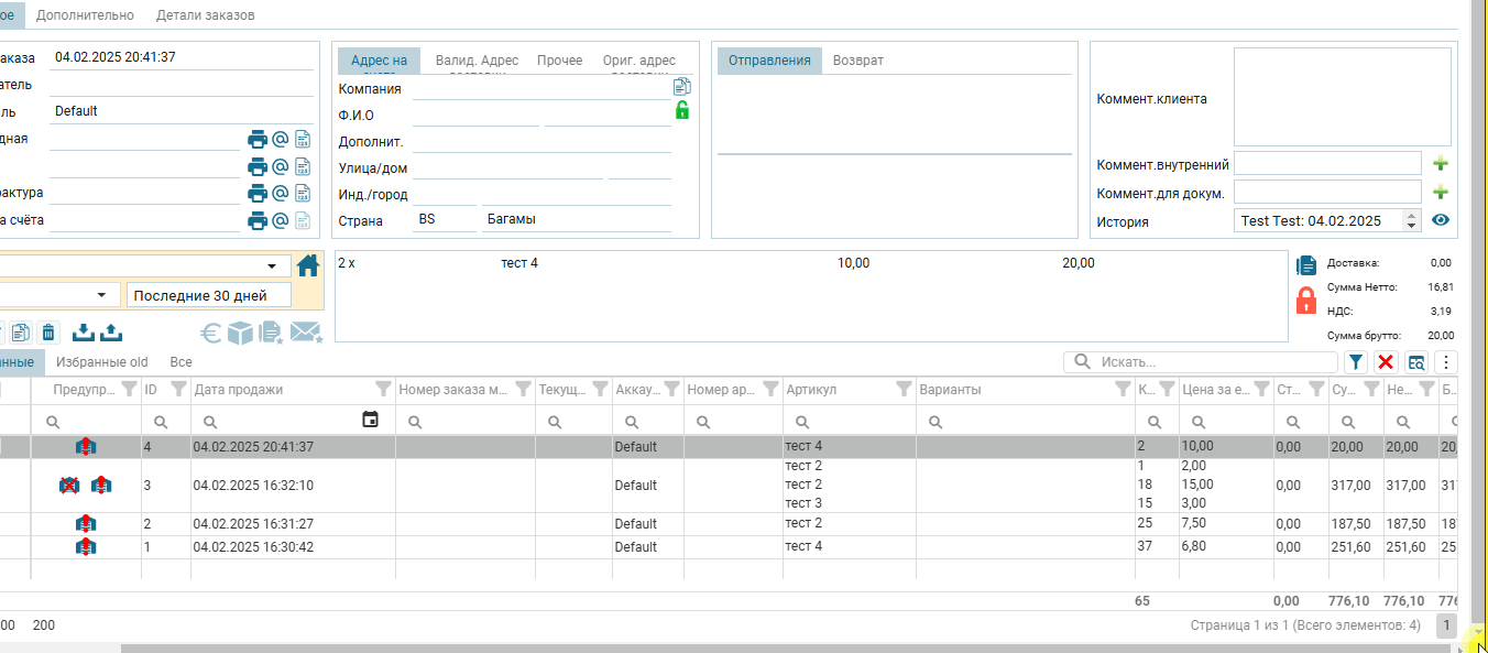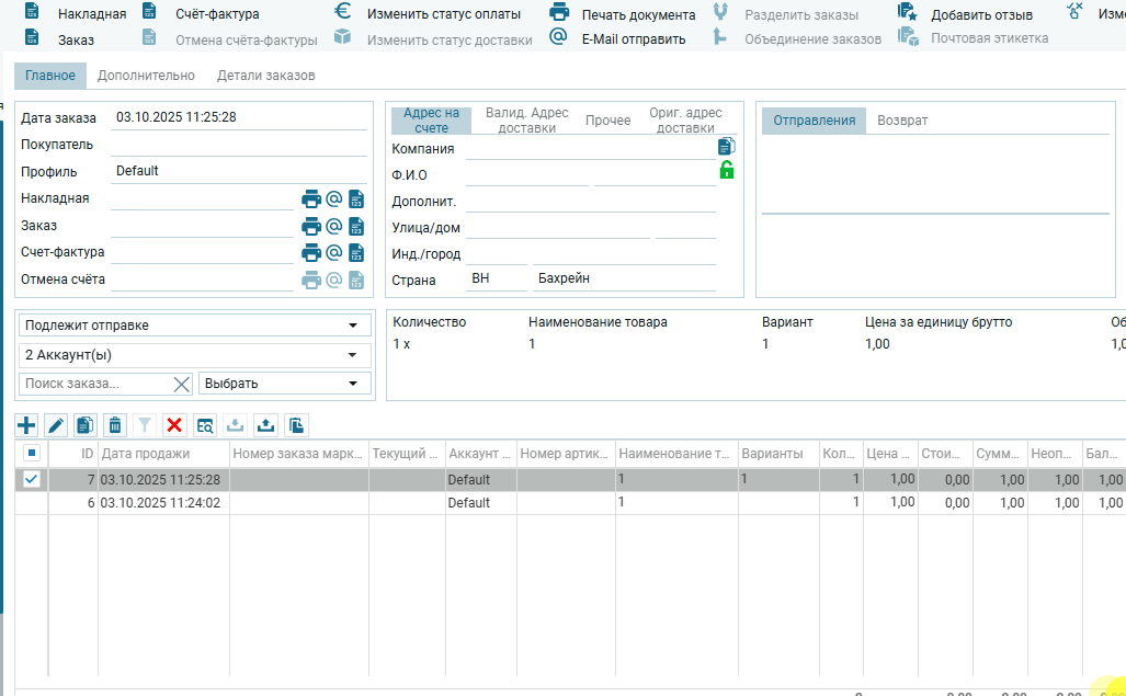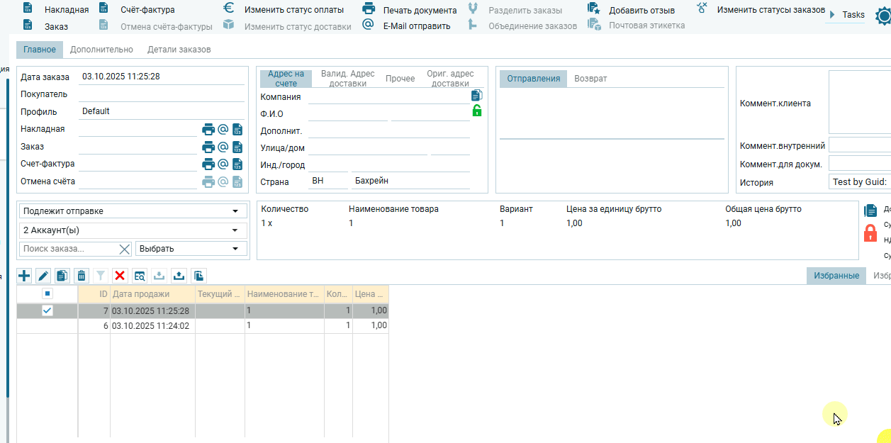 Подробности по товарным позициям в редакторе заказа: