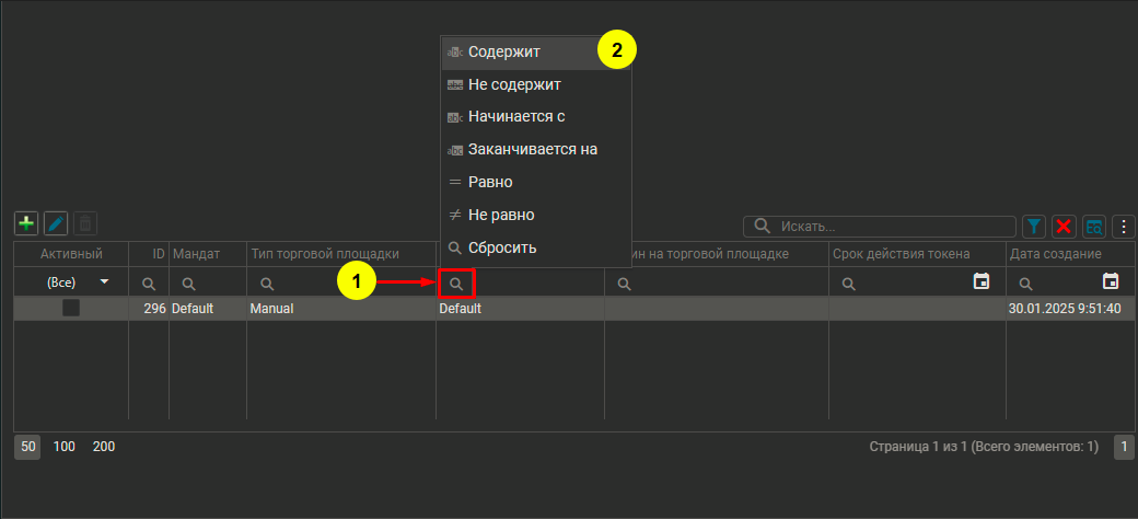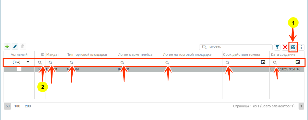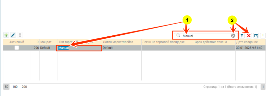 Поиск по таблице осуществляется в поле, куда вводятся искомые значения (1), для отмены поиска по таблице можно нажать на серый крестик в правом углу поля или на красную иконку (2). Если искомые значения содержаться в объектах, которые хранятся в таблице, то в таблице будут выведены все объекты, в которых есть искомые значения.