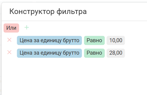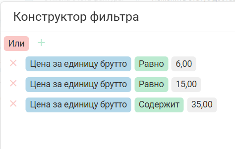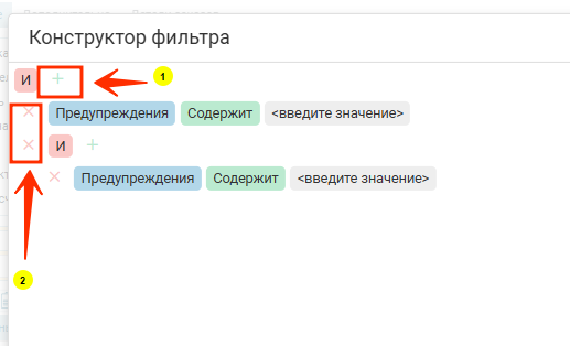 Плюсик (1) — добавить условие, крестик (2) — удалить условие:
