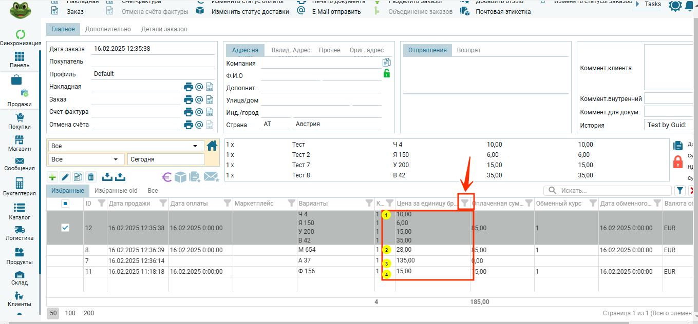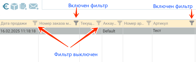 Особенностью фильтрации по столбцу с участием мультизаказа является то, что в фильтрации учувствует значение только первой товарной позиции мультизаказа.
