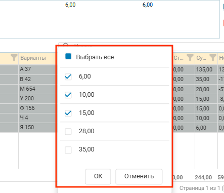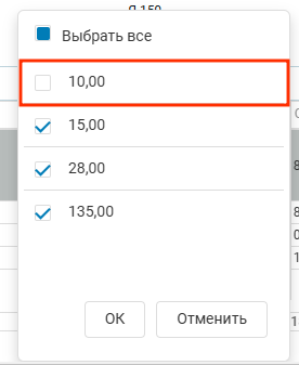 появится список с существующими в столбце значениями. Слева от значений находится чекбокс, который определяет выбор того или иного значения для фильтрации.