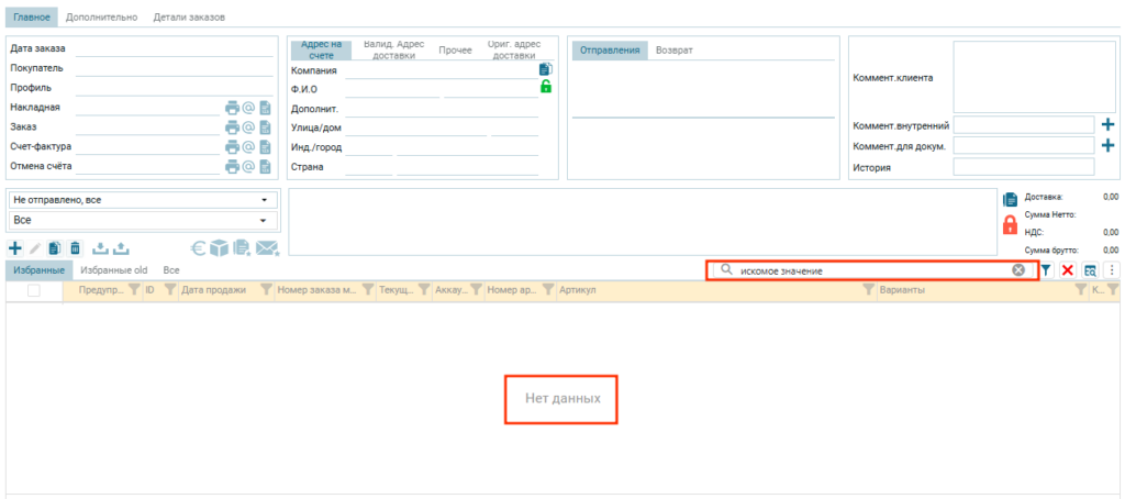 Если объекты содержащие искомые значения не найдены, то таблица будет пустая и появится сообщение «Нет данных»