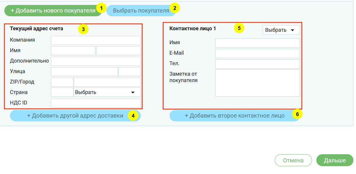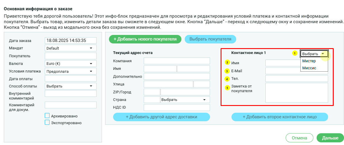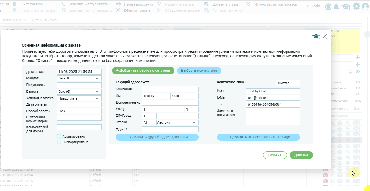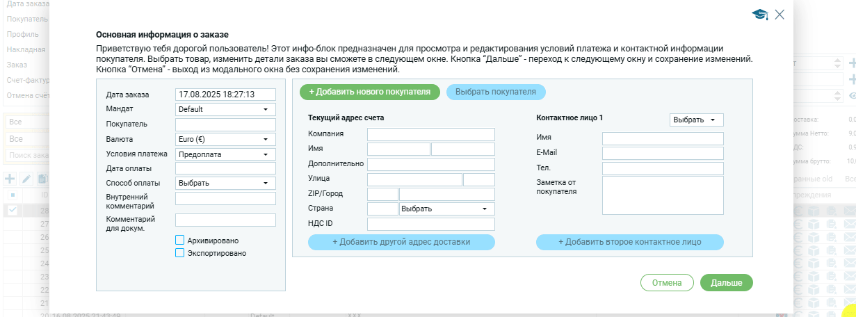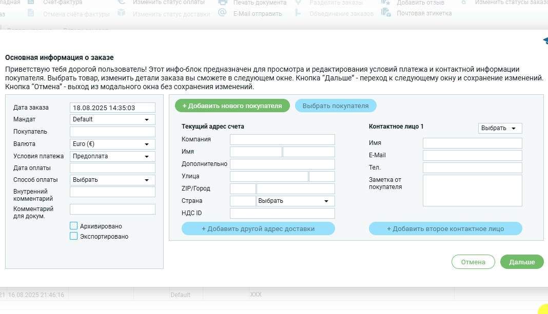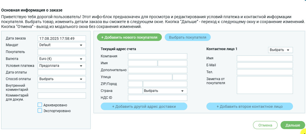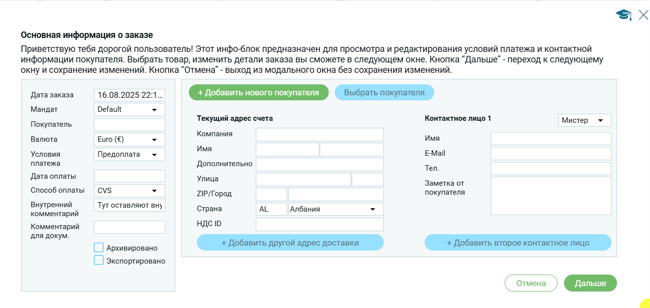 3. В случае создания заказов вручную, пользователь заполняет данные самостоятельно на основании данных предоставленных покупателем.