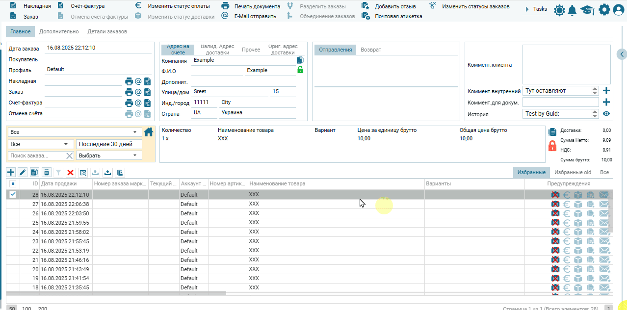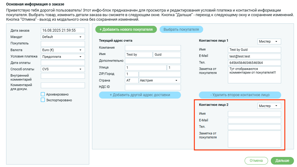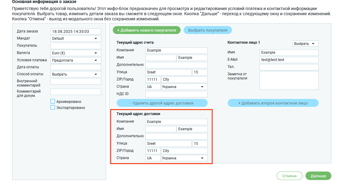 3. Текущий адрес и адрес доставки не совпадает. В случае создания заказов вручную, пользователь редактирует данные самостоятельно на основании данных предоставленных покупателем.