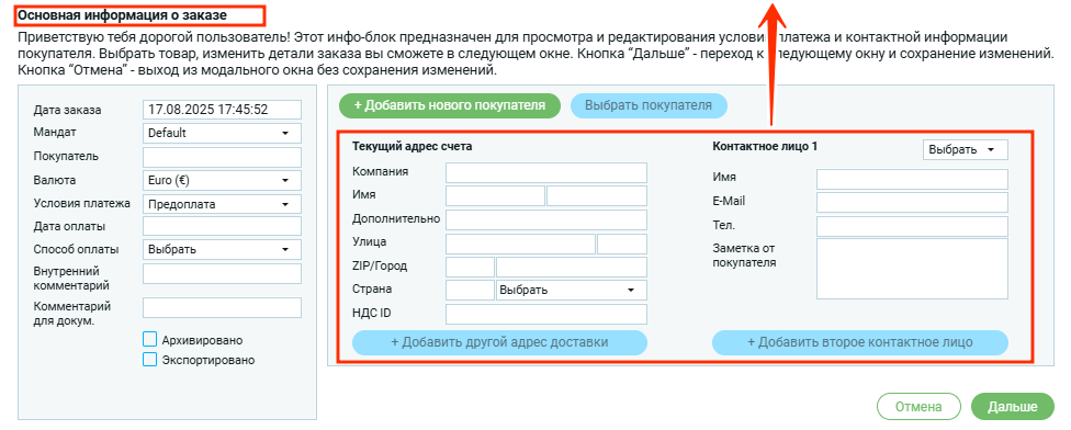 2. В случае создания заказов вручную, заполняется автоматически через функцию «Добавить нового покупателя» или «Выбрать покупателя«;