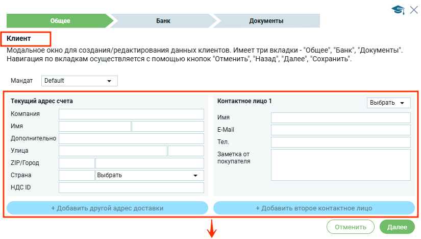 Что бы заполнить дополнительные контактные данные нужно нажать на кнопку «Добавить друое контактное лицо» после чего откроется дополнительный функционал для обзора и редактирования дополнительных контактных данных.