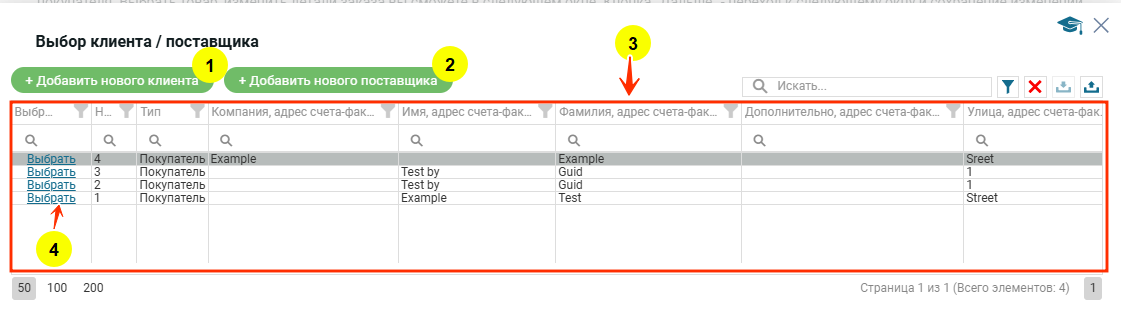 • Таблица со списком покупателей / поставщиков — список созданных клиентов и поставщиков. ;