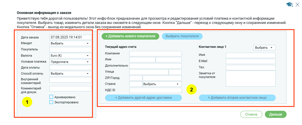При создании / редактировании заказа открывается модальное окно, где пользователь заполняет: