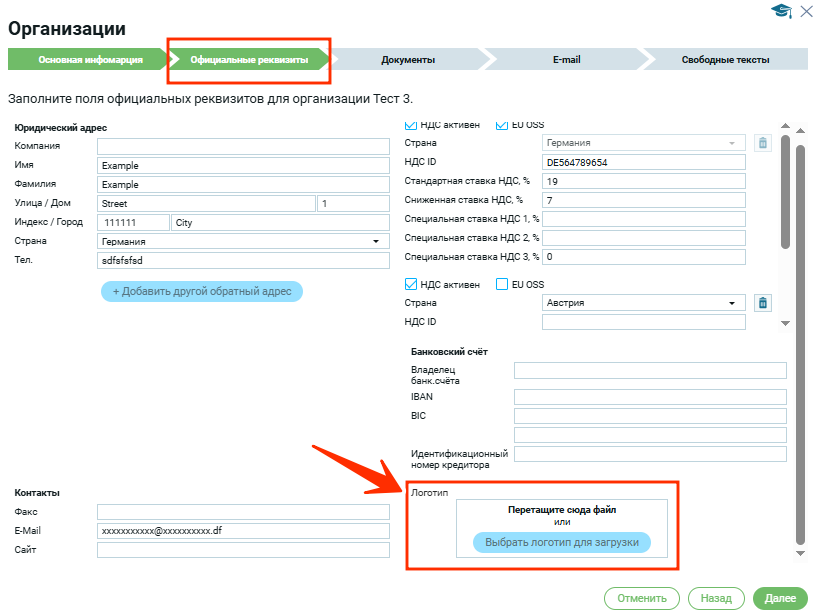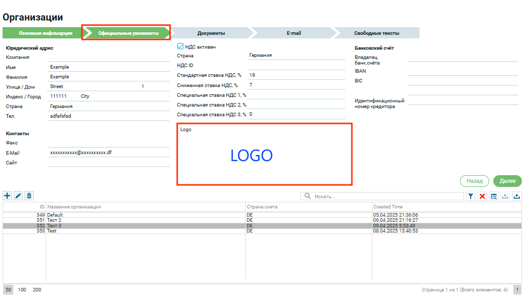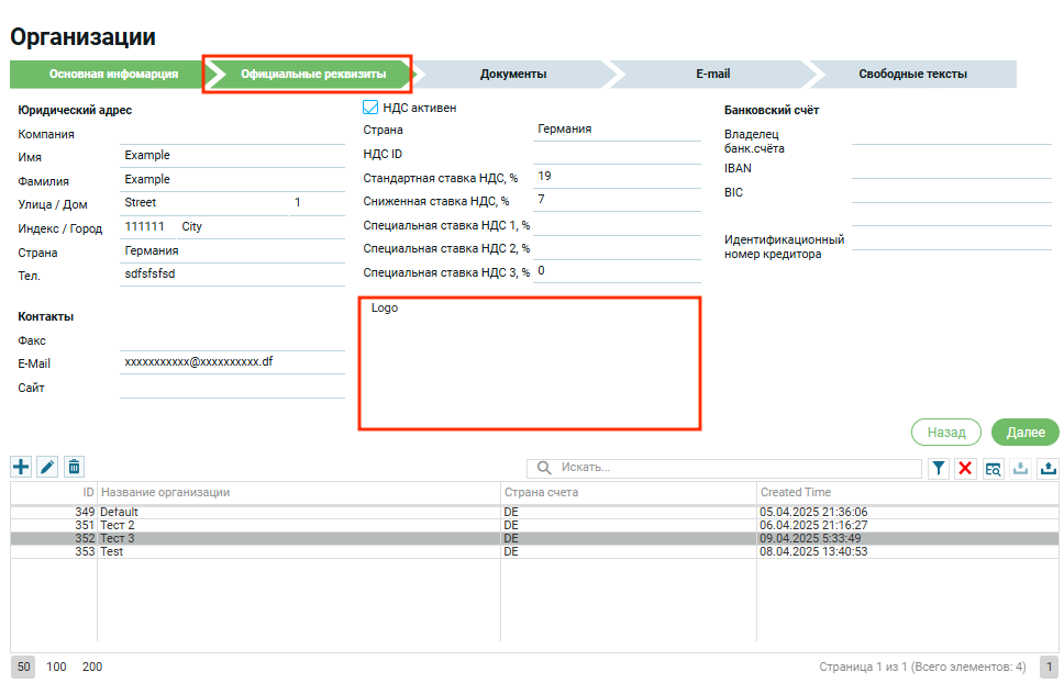 Для редактирования / создания логотипа нужно перейти в модальное окно. Для этого нужно нажать кнопку или выбрать в таблице организацию и нажать на кнопку . Выбрать вкладку «Правовая информация«, перейти к выбору / редактированию логотипа.