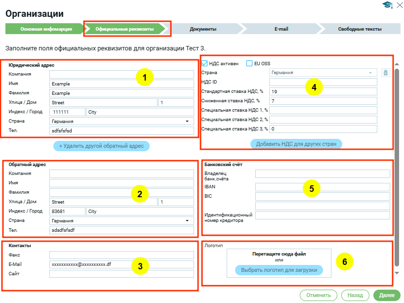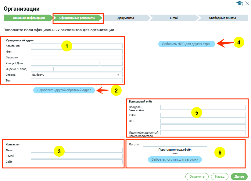 Вкладка «Правовая информация» предоставляет доступ к основным официальным данным организации: юридический адрес, налоговые сведения, банковские реквизиты и логотип организации.
