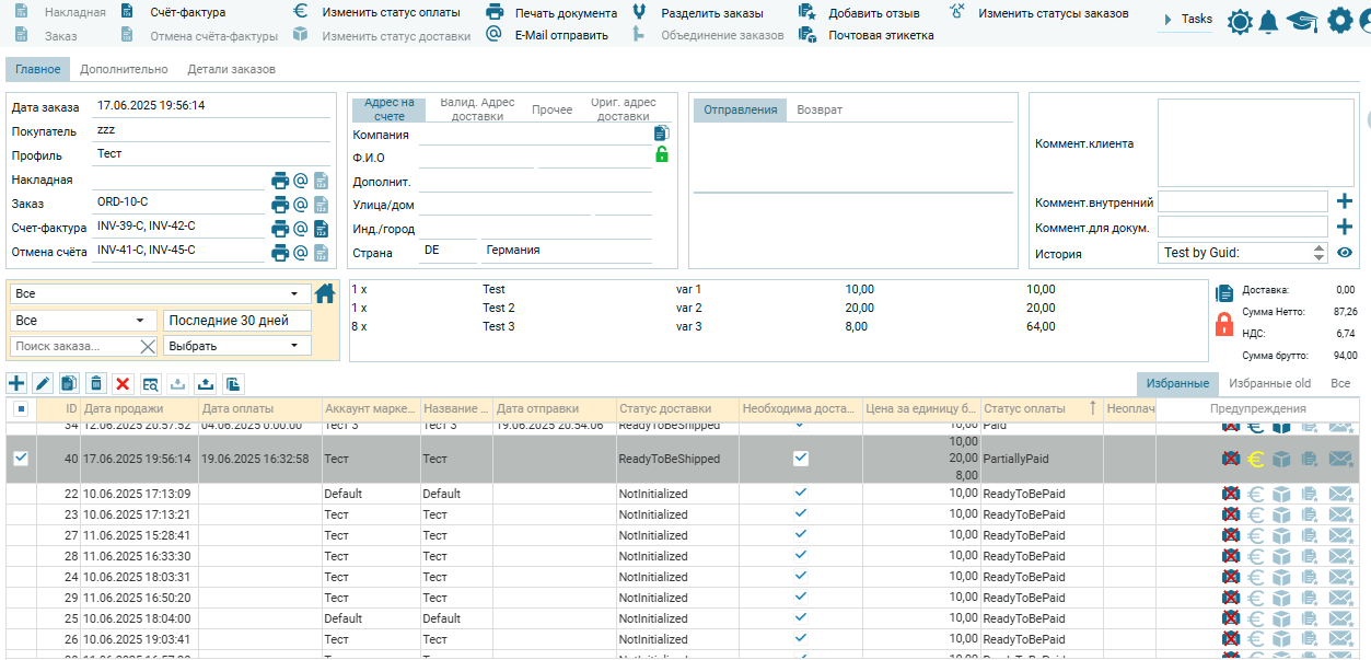 Информация по номенклатуре заказа соотвествует информации в заказе, если его открыть в модальном окне. Для того что бы открыть модальное окно нужно выделить заказ и нажать на кнопку редактировать