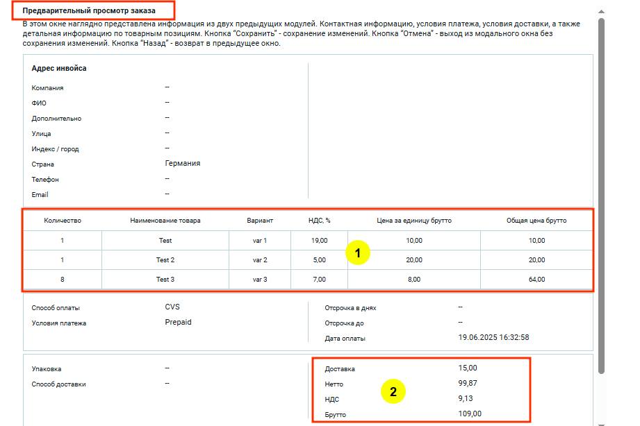 . В модальном окне перейти на вкладку Заказать товары и далее на вкладку Предварительный просмотр заказа. Информация в этих вкладках будет соответствовать информации по товару в Обзоре.