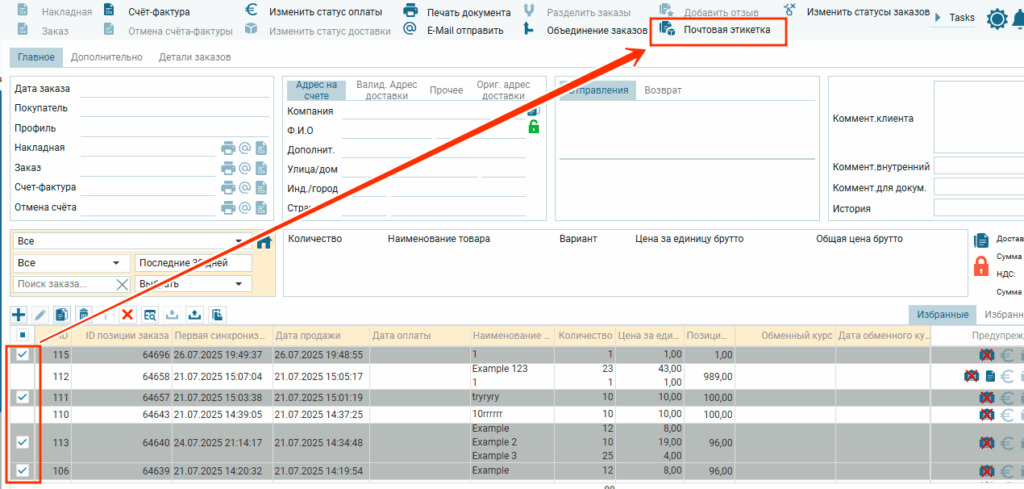 Для создания этикеток в интерфейсе Продажи предназначена специальная функция. Для того что бы воспользоватьтся этой функцией нужно выбрать заказ или заказы и нажать на «Почтовая этикетка» в функциональном меню.