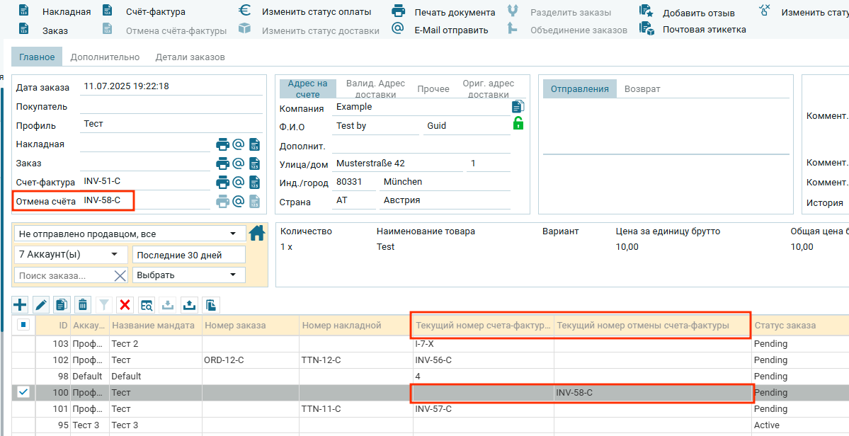 Такой же сценарий с Отменой счет-фактуры. Если будет к этому заказу создана Счет-фактура, номер Отмены счет-фактуры исчезнет из поля Текущий номер отмены счет-фактуры, а вполе Текущий номер счет-фактуры появится номер новой Счет-фактуры.
