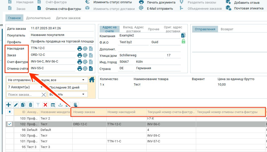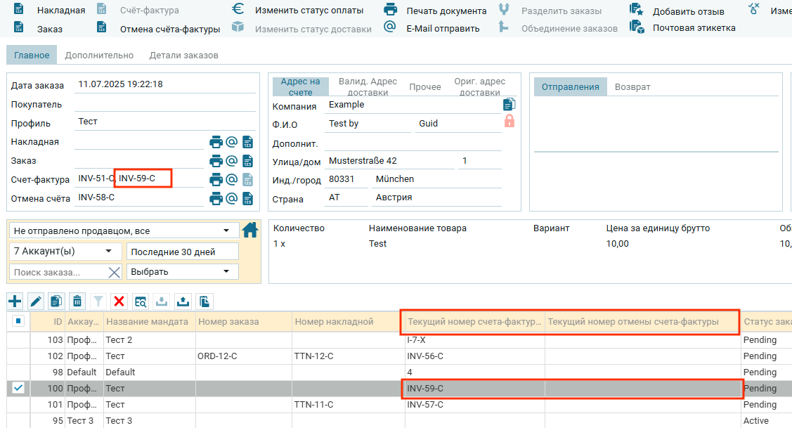 На скрине видно, что для данного заказа номер счет-фактуры отстутствует в поле заказа, так как она уже не является текущей, а есть номер текущей Отмены счет-фактуры.