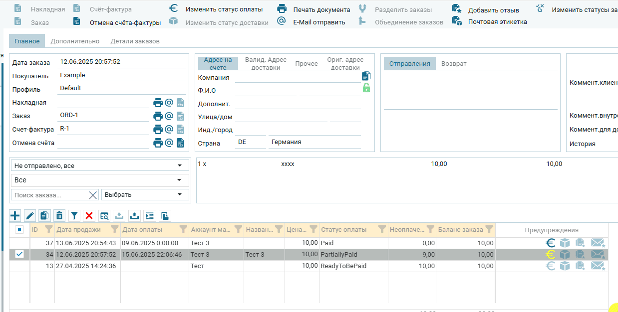 В итоге, после подтверждения изменения статуса, заказ может получить три варианта нового статуса; «Оплачен», «Частично оплачен», «Переплачен«.
