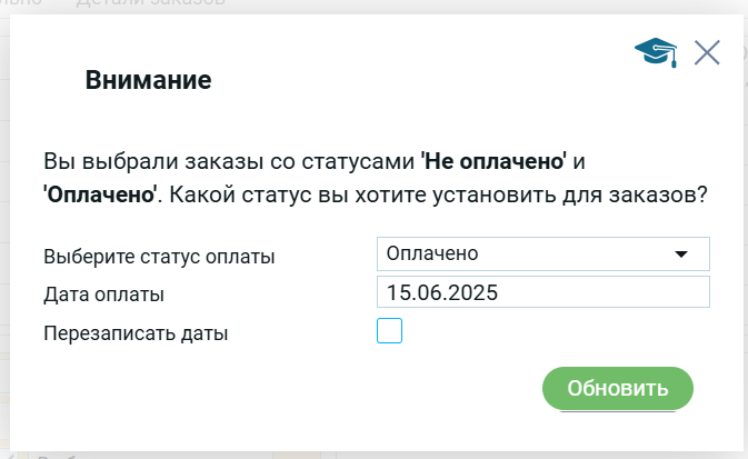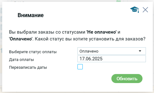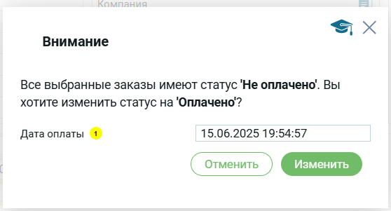 Если для изменнеия статуса оплаты выбрано более одиного заказ, то появляется модальное окно с одним полем — возможностью выбрать дату оплаты.